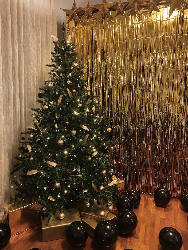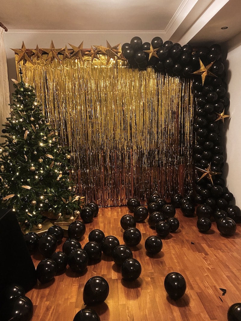 La particolarità di questo party è che capitava nel mese di dicembre e per questo motivo non ho resistito dall’inserire negli allestimenti anche un tocco natalizio in tema. La palette colori scelta è stata il nero e l’oro. Lo sfondo scintillante circondato da stelle e palloncini, l’albero di natale con palline nere e piume oro hanno fatto da scenografia per un momento torta straordinario!