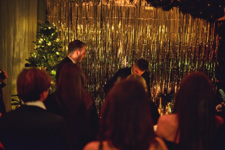 La sala è stata allestita con tavolini da bar con tovaglia nera per ricreare lo stile di un classico bar da cocktail anni ’20. Non mancavano fotografie in bianco e nero e dettagli vintage per rendere tutto più realistico.